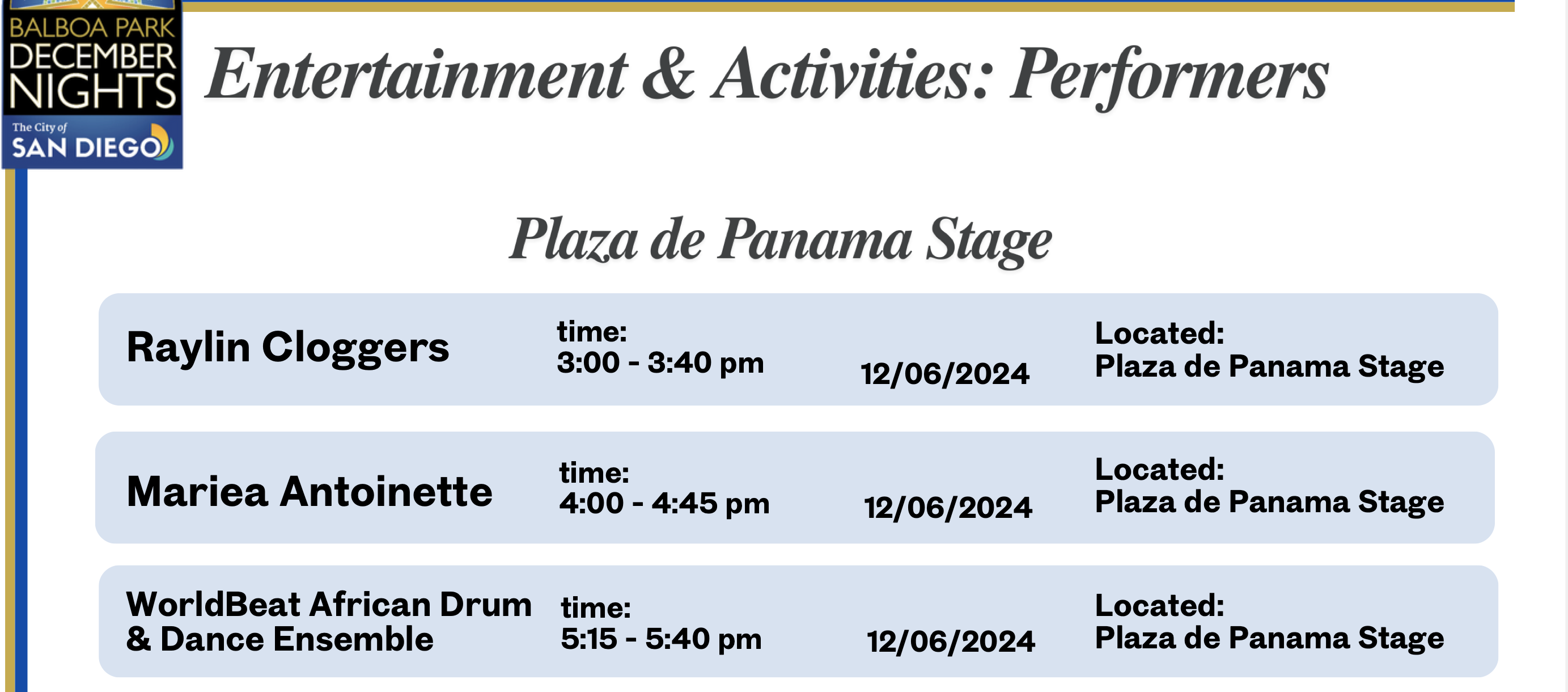 Join us on December 6 and 7 for the City of San Diego’s largest free holiday festival in beautiful Balboa Park. The family friendly event brings San Diegans together to enjoy the lights, the sounds, the attractions and of course, the amazing food. WorldBeat Center is excited to return with cultural performances including Japanese Taiko, African Drum and Dance and Jazz strings.