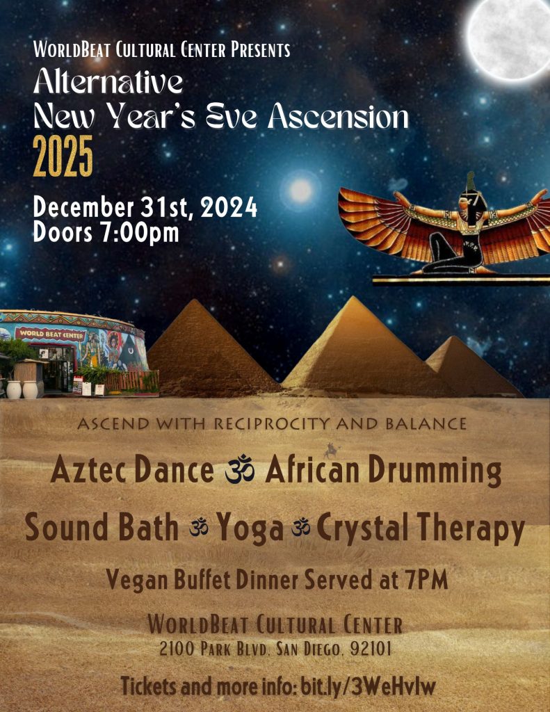Join us at the WorldBeat Cultural Center as we honor ancient Egyptian traditions, the mystical star Sirius, and embark on a spiritual journey into the new year. Engage in rejuvenating yoga sessions, soul-soothing sound healing, captivating Aztec dance performances, and delight in a renowned international vegan buffet. This unique event welcomes individuals of all creeds and cultures, uniting us in the spirit of harmony.