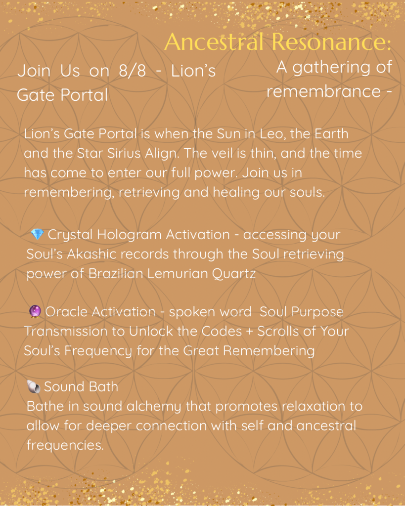 Join us under the powerful energies of the Lion’s Gate Portal, when the Sun in Leo, the Earth, and the star Sirius align. This sacred window opens a direct connection to higher consciousness, offering an opportunity to retrieve, remember, and activate your soul’s divine blueprint.