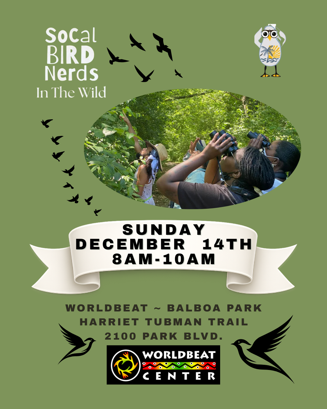 Join SoCal Bird Nerds and WorldBeat Cultural Center for a refreshing morning of birdwatching along Balboa Park’s beautiful Harriet Tubman Trail. Whether you’re an experienced birder or brand new to the practice, this outing offers a welcoming space to explore nature, learn together, and connect with the birds that call our urban oasis home.