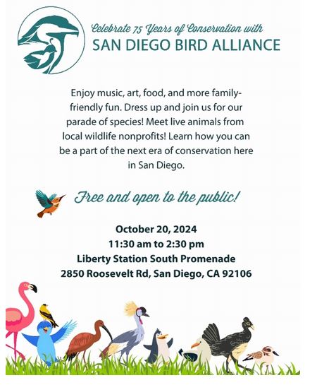 Join us as we celebrate the San Diego Bird Alliance’s (formerly known as the San Diego Audubon Society) 75th anniversary! Visit our table to say hello and check out our African Drummers and Dancers.
