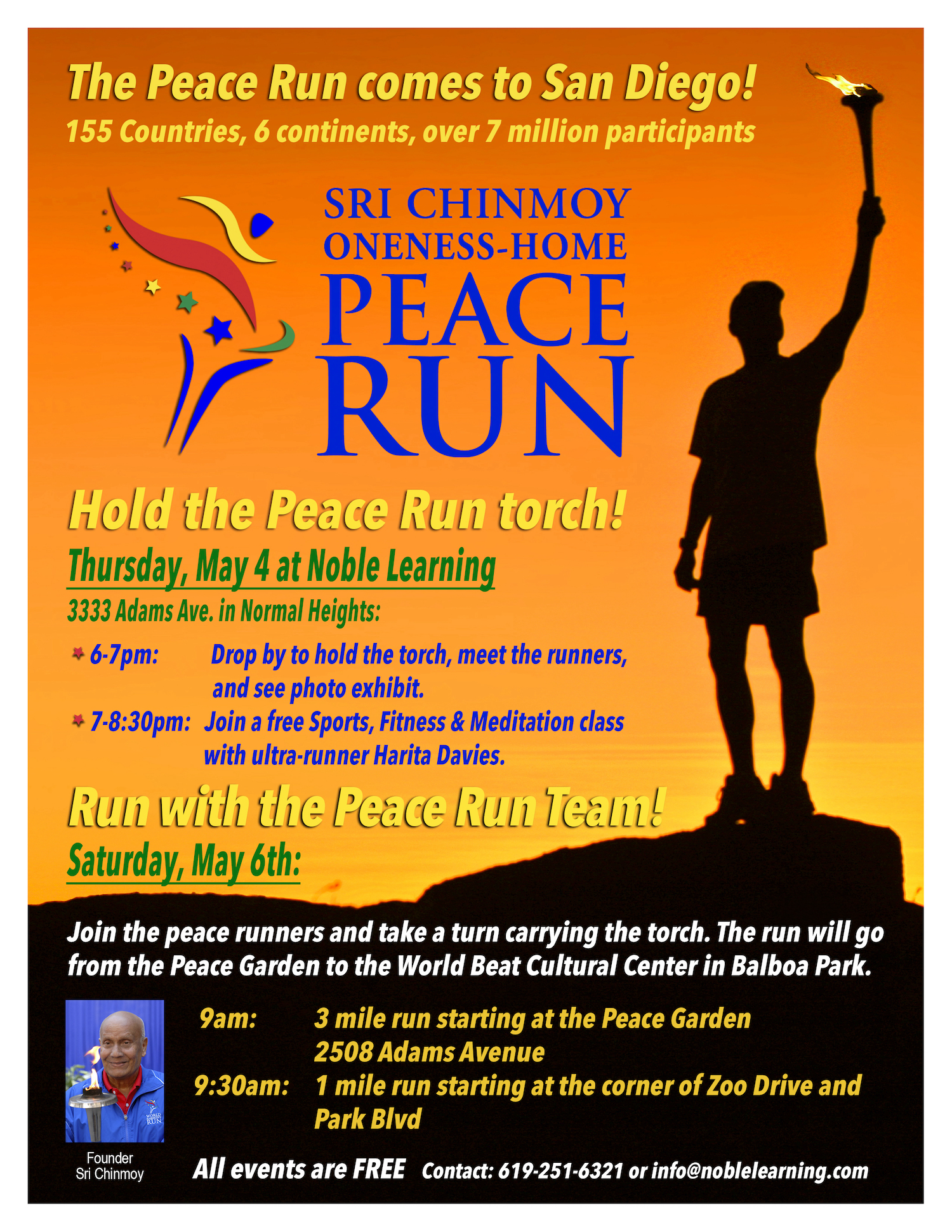 The Peace Run is an International Torch Relay Run, founded by Peace Advocate, Sri Chinmoy in 1987. Its purpose is to promote and raise awareness for Peace and Harmony. It does this through programs and meetings at schools and with organizations along its routes. Our motto is “Peace begins with me”. Typically, in a full Peace Run year, teams of runners go through more than a hundred countries and cover tens of thousands of miles, including ten thousand miles around the US and Mexico and Canada. This year we are doing local events across the country this Spring–we will be in the San Diego area May 2nd through May 6th, Tuesday through Saturday. Before San Diego, we are going to El Paso, and after, we are going to Seattle.