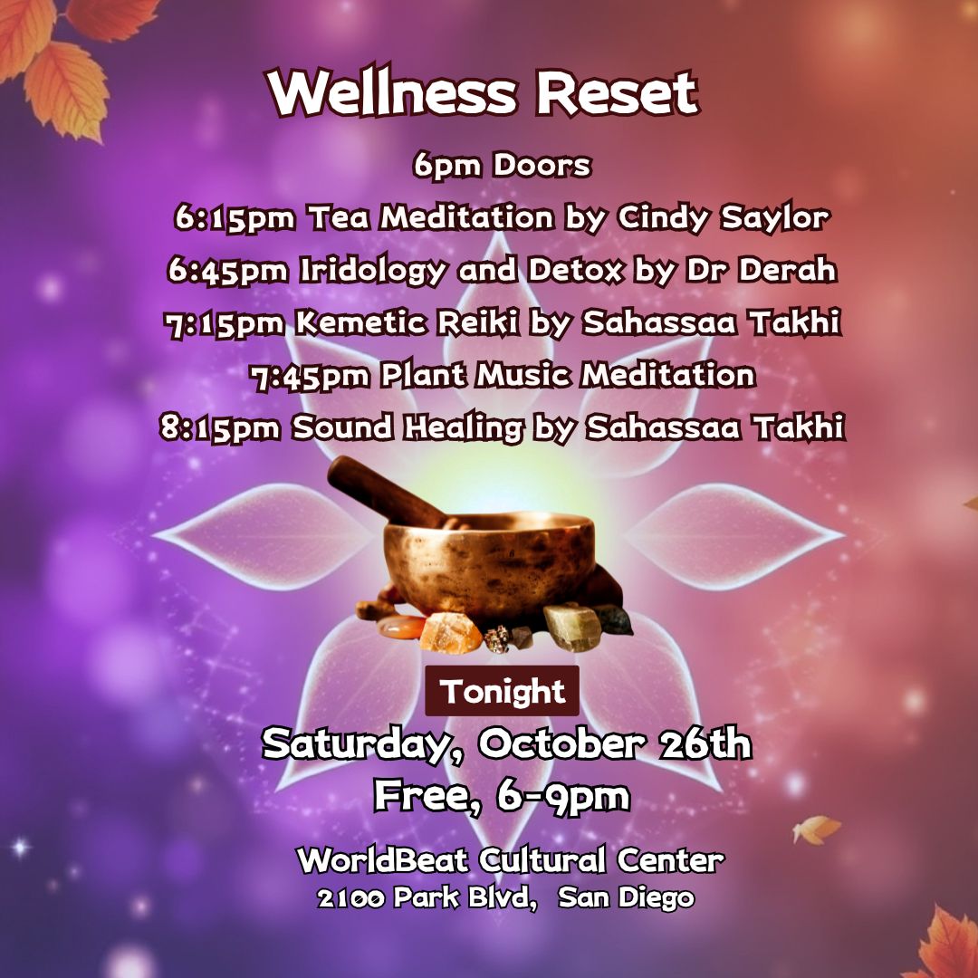 Saturday, October 26th WorldBeat Center is giving you a chance to reset your body temple for this coming season. We are seriously livicated these coming seasons to your health, wellness anxiety and transformation. Join us at the WorldBeat Center your passport to health and wellness. We will have great practitioners of Kemetic Reiki, Iridology, Herbs, Sound Healing and Vibrational Therapy. We will also have appetizers and teas.